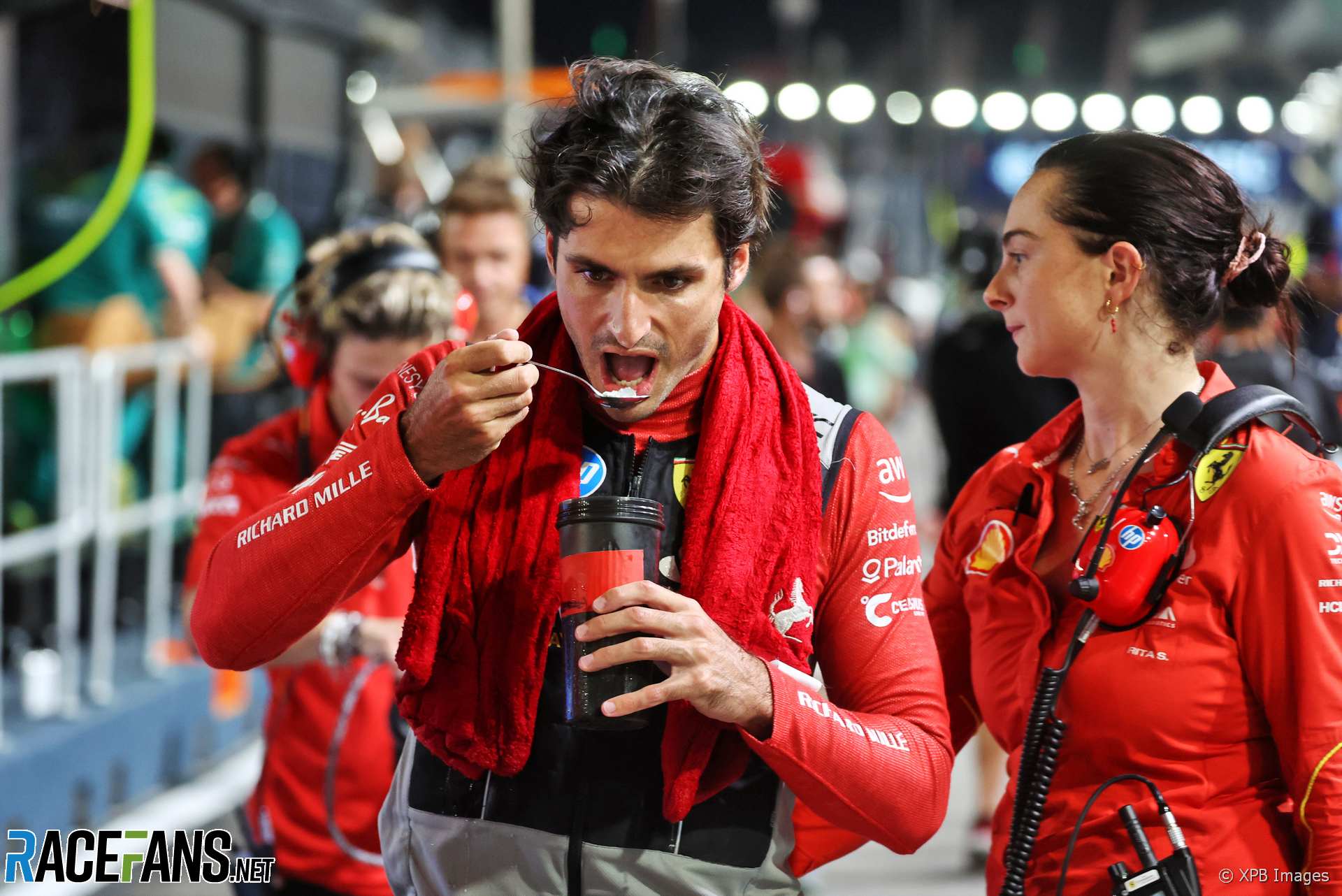 in Racing Caption Competition 250: Snack for Sainz by dan September 28, 2024, 11:59 am What was Carlos Sainz Jnr thinking as he enjoyed a pre-race snack in Singapore? Can you come up with the best caption for this picture? Source More
